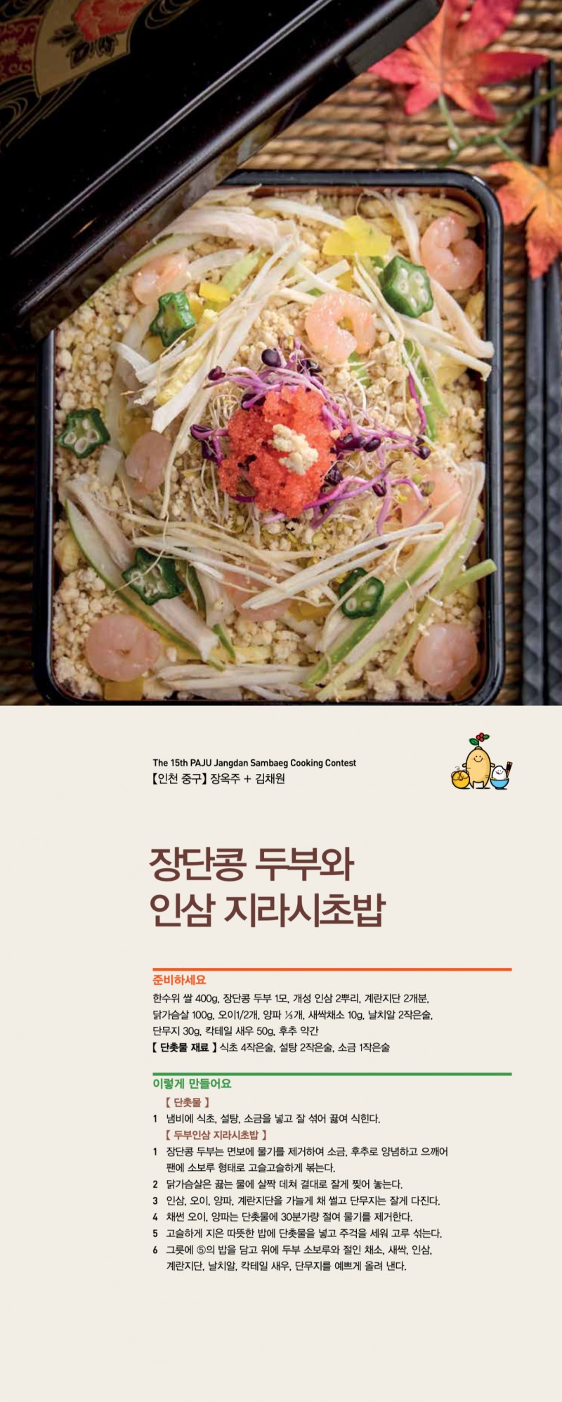 [2024 파주장단삼백요리대회]장단콩 두부와 인삼 지라시초밥 관리자 아이디로 검색 0 1,297 2024.11.27 18:00 첨부파일 - 첨부파일: 10.jpg (2.1M) 79 2024-11-27 18:00:58 짧은주소 - 짧은주소: http://yori.or.kr/bbs/?t=16Q 주소복사 × 짧은 글주소 복사 Note! 위 주소를 드래그, 복사(Ctrl+C)하여 사용하세요. 이전글다음글 검색목록 본문 장단콩 두부와 인삼 지라시초밥 댓글목록 등록된 댓글이 없습니다.